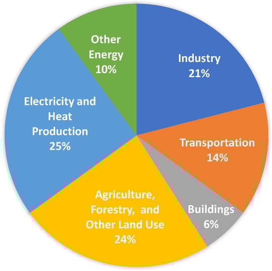 Trucks are necessary to carry drones and supplies as well as parcels in last-mile drone delivery. However, trucks mostly use fossil-based fuels that cause the Green-House Gas (GHG). Edenhofer et al. [] reported in 2014 that transportation produces 14% of the global GHG and 95% of the world transportation energy is from fossil fuels. Figure 6 depicts a pie chart of global GHG emissions by economic sectors using the data reported by Edenhofer et al. []. Due to the adverse effects of GHG on the environment, reducing GHG is a critical problem to solve. This problem also matters to retail businesses as they use trucks that consume fossil fuels for transportation and delivery.
