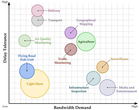 Highlighting diverse UAV applications for smart cities. An increase on the x-axis indicates higher-bandwidth applications, and an increase in the y-axis represents a higher delay tolerance. The size of the circles reflects the size of the UAV swarm needed to provide robust service.