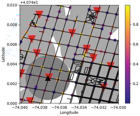 A part of Hoboken, New Jersey, USA, is shown on the map above, which displays the coverage by the integrated RSU/UAV infrastructure during peak hours. The light gray highlights denote the RSU coverage (red inverted triangles), and the dark gray areas convey the UAV base station coverage (black triangles). All other points’ colors signify their “fitness”, a standardized utility value, with a value of one being a pivotal point to cover; otherwise, a zero value indicates an insignificant point.