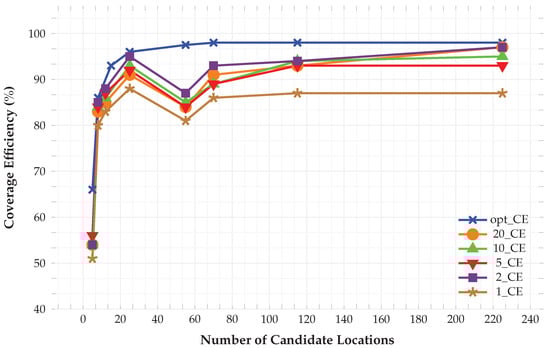 Figure 3 depicts the effect the number of candidate locations had on the overall effectiveness of the joint RSU/UAV coverage using the optimal approach and a heuristic approach. The exact approach, denoted by opt_CE corresponded to the solution obtained by solving the optimal MIP, which is, in practice, very complex. Therefore, we designed a heuristic algorithm to optimize the planning. The heuristic approach had different levels of increments, denoted by, e.g., 2_CE, 5_CE, and 10_CE in the figure (i.e., dividing the power budget into several possible values), achieving a trade-off between complexity and coverage efficiency [36]. The heuristic increments corresponded to how the algorithm incremented the reduction in the power for a potential unit (charging station or RSU). The larger values were essentially larger step sizes for reducing power. Hence, 2_CE corresponded to a decrease of 2% from the maximum per step size (50 total potential settings in power to the base station) and 50_CE corresponded to 100%, 50%, or not set/installed. The smaller values had more degrees of freedom when iterating for a solution, at the cost of requiring more steps to find a solution. Therefore, in terms of coverage efficiency, the algorithm tended to perform better with small increments. The case of 1_CE corresponded to the highest complexity level of the algorithm. However, the algorithm failed to achieve the effective coverage efficiency due to the fact that the maximum number of iterations had been reached and the algorithm failed to achieve a near-optimal solution. Hence, 2_CE achieved the best coverage efficiency in our setting. Figure 3 also shows that as the number of candidate points (out of the around 215 total points of interest in the problem scope) increased, the overall coverage efficiency increased, but only to a certain point. This was likely due to the fact that beyond a certain threshold, the likelihood of an effective candidate location being contained in the set of all candidate locations increased rapidly. It could be observed that beyond the consideration of one-quarter of all points, there was no immense benefit to consider any more, as there was no notable increase in coverage efficiency with a drastic increase in complexity beyond that point.