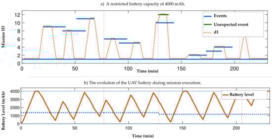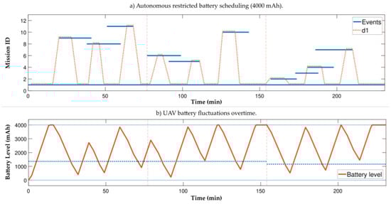 (a) Autonomous scheduling of a restricted battery capacity of 4000 mAh in the case of an unforeseen incident, and (b) the evolution of the UAV battery during mission execution. The green line conveys an unexpected event.
