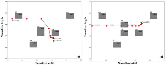 The UAV generates autonomous pathways to its destination. The red dots denote the UAV path, the green dots symbolize the target, and the gray boxes represent the obstacles. (a) Environment 1 and (b) environment 2. The height of each obstacle is indicated above it. The z-values indicate the altitude of the UAV at that position.