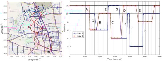 For tractability and clarity, Figure 7 illustrates a simplified scheduling scenario using two UAVs aiming at completing four missions. Two missions were selected to be relatively long such that the UAV battery, even full, would not be enough for a UAV to complete the task alone. Two charging stations were available in the area. The MILP was solved using off-the-shelf software to find the optimal activity plan for each flying unit [41]. The long missions 2 and 3 required both UAVs to cover them consecutively. UAV 2, the closest to mission 3, started the mission, allowing UAV 1 to reload its battery to pursue the task sufficiently. UAV 1, which initially took off from charging station 1, landed on charging station 2 to continue covering mission 4. A similar remark can be made for UAV 1. Optimized scheduling allowed a better fleet management by using the minimum resources.