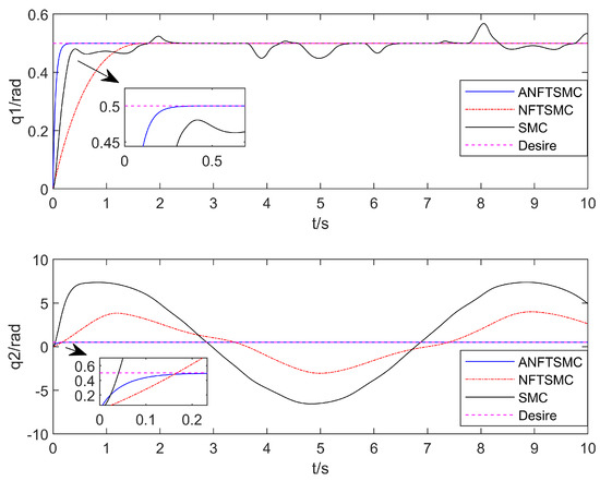 With regard to the convergence speed: as can be seen in Figure 3, Figure 4, Figure 5 and Figure 6, the method in this paper enables the aerial manipulation system to track all the expected values on the left and right; the terminal sliding mode and the traditional sliding mode are also capable of tracking the values, but the convergence speed is slower than the method in this paper. When the system model is uncertain and there is continuous external interference, the three methods can effectively track the position and attitude angles. However, as can be seen in Figure 7, for joint angle 2, only the method in this paper can effectively track, and the curves of the other two methods are offset. In conclusion, the adaptive nonsingular fast terminal sliding mode control method with the disturbance observer proposed in this paper can track the desired trajectory faster and make the convergence occur more quickly.