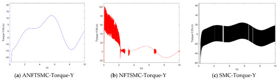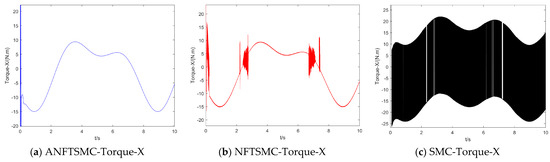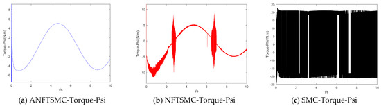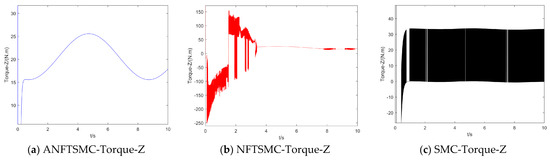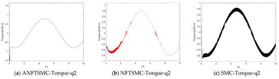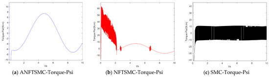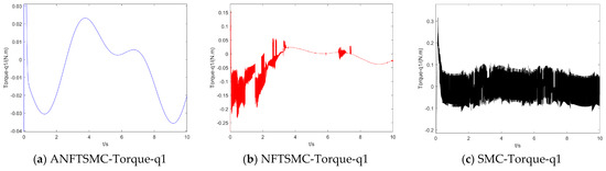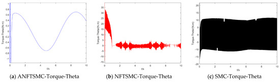 Concerning the input torque, the following can be noted: the input torque of the controller is shown in Figure 11, Figure 12, Figure 13, Figure 14, Figure 15, Figure 16, Figure 17 and Figure 18; from left to right, these are (a) the proposed method, (b) the terminal sliding mode, and (c) the traditional sliding mode. It can be seen that the traditional sliding mode has a lot of chattering, and the terminal sliding mode has slightly reduced chattering as compared with the traditional sliding mode. However, the algorithm in this paper hardly experiences chattering due to the use of the disturbance observer, adaptive rate, and nonsingular fast terminal sliding mode surface.