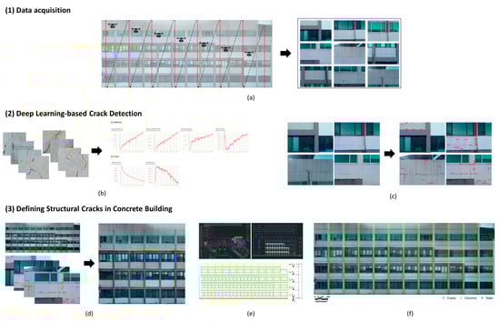 Overview for defining structural cracks in the exterior walls of concrete buildings using a UAV: (a) Drone-based aerial photography; (b) construct deep learning dataset; (c) detect cracks through deep learning; (d) generate orthoimage based on point cloud technique and superimpose crack layer; (e) define the structure of exterior walls of the building using design drawings; (f) define structural cracks through superimposed building crack expression data and design drawings.