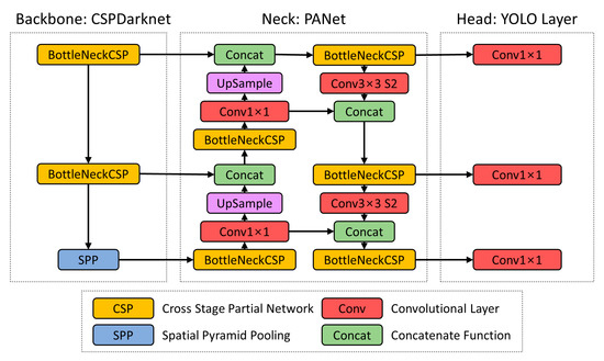 Subsequently, cracks in concrete buildings were detected using the YOLO V5 model, the latest object detection algorithm in the you-only-look-once (YOLO) product group. YOLO V5 is a machine learning algorithm with high processing speed and accuracy applicable for crack detection [30]. Figure 2 shows the architectural composition of YOLO V5.