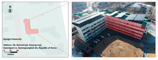 A target site was selected to verify the proposed method. The target site was a concrete building of Kyungil University in Gyeongsan-si, Gyeongsangbuk-do, Korea. The proposed crack detection process was possible because cracks were identified in the exterior of the building. Moreover, this building was suitable for the proposed research method because the cracks were distributed throughout the structural and non-structural parts of the building. Figure 3 shows an overview of the target site where the aerial photography was performed.