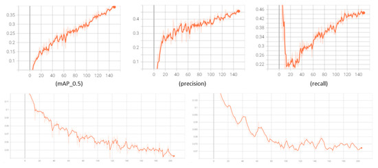 Subsequently, the model was trained with a batch size of 16 and 150 epochs. Figure 4 shows the mean Average Precision (mAP), precision, recall, train_loss, and validation_loss values obtained through training. mAP (mean average precision) is obtained by obtaining one AP value per object and obtaining the average value of AP for each class. Further, YOLO V5 uses the sum-squared error between the predicted value and the actual value to calculate the loss, which is represented by box_loss and obj_loss.