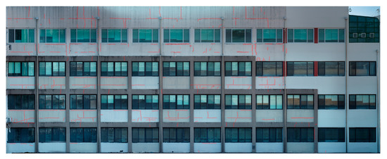 The UAV-based aerial photography was performed through manual flight in a single-grid format of the exterior of the target building on 10 December 2022. The 44 min flight yielded 647 images (ISO-100, aperture F/4, shutter speed 1/120 s, shooting angle 0°). The angle between the building exterior and camera sensor was set to perpendicular, and the shooting distance was set to 2 m, according to the literature review in Section 2.1. Although obtaining aerial photographs with uniform image overlap through manual flight is challenging, aerial photographs with image overlap of at least 65% were obtained. The ground sample distance (GSD) of the aerial images was found to be 0.16 cm/pixel, indicating their usability for crack detection.