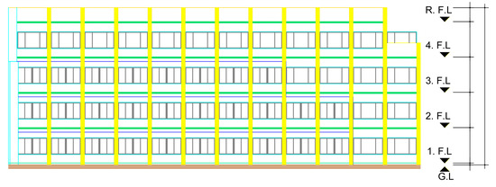 Using the design drawings, the exterior wall structure of the building was defined with the floor plan, elevation, sectional view, and structural drawings of the site. The structural members of the exterior walls of the building were defined using the floor plan, sectional view, and structural drawings. The locations of the structural parts in the exterior walls were defined using the floor plan and elevation. Figure 8 shows design drawings defining the locations of structural parts.