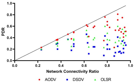 Figure 2 shows how network connectivity affects routing protocol performance. Given the communication distance of UAV nodes and the topology of the nodes, NCR only indicates the percentage of packets that can be sent from a node to GCS in the network. Therefore, the PDR performance of a routing protocol cannot be higher than the value of NCR. In Figure 2, the center line indicates the maximum performance of PDR. Interestingly, when the NCR value is low, the PDR value is close to the center line. However, when the NCR value becomes higher, the PDR values are farther away from the center line. This means as the NCR value becomes higher, the performance of PDR decreases.