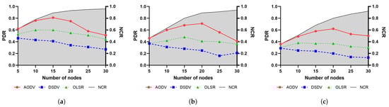 To understand the reasons, we marked the NCR values in Figure 3. For example, in Figure 3a, the gray area represents the NCR values. In the figure, as the number of nodes increases, the NCR value increases. If the number of nodes is 30, the NCR value is close to 1.0. It means that almost all nodes are connected. In this case, we expected that most of the packets could be sent from a node to GCS, and the PDR performance would increase. However, in our simulation, we observed that the PDR performance of AODV, OLSR, and DSDV decreased from when the number of nodes was 20, even if the number of nodes increased.