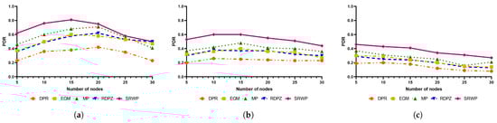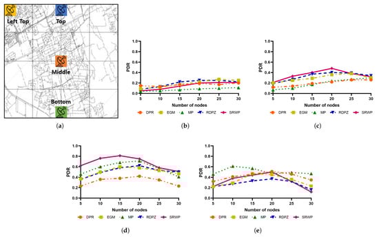 Packet delivery ratio: (a) SRWP, (b) MP, (c) RDPZ, (d) EGM, and (e) DPR.