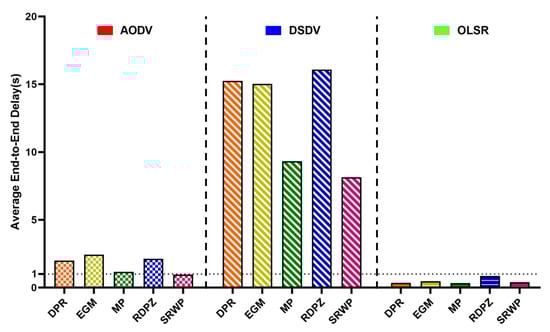 The end-to-end delay represents the time taken for a packet to be delivered from the source node to the destination node. We measured the end-to-end delay only when the packet was successfully delivered. The end-to-end delay metric is defined as the time period between when the packet is sent from the source node and when the packet arrives at the destination node as follows: