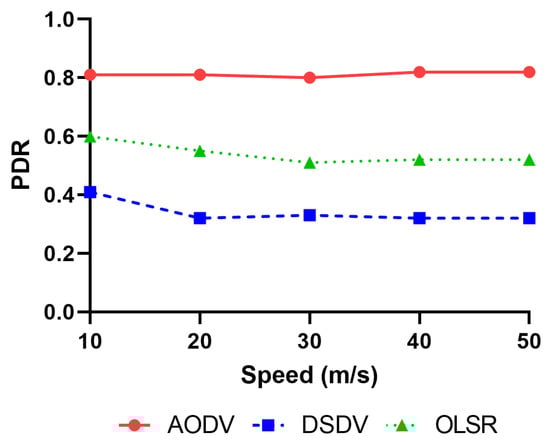We also evaluated the PDR performance of AODV, DSDV, and OLSR by changing the speed of nodes. In the experiment, we simulated AODV, DSDV, and OLSR using the SRWP mobility model, which showed the best PDR performance in Section 5.3. When it comes to the number of nodes, we set up 15 nodes which showed the best PDR performance in Section 5.3 overall. Figure 8 shows the experimental results. In our experiment, we find no significant changes in the PDR performance of AODV, DSDV, and OLSR according to the change in the node speed. Our results contradict the findings in the previous studies that reported the speed of nodes influenced the PDR performance changes [8].