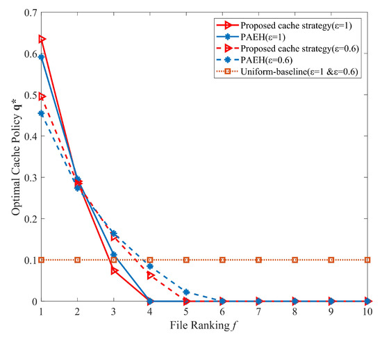 In Figure 2, we introduce the distribution probability of files under the proposed caching strategy, the PAEH caching strategy, and the uniform-baseline caching strategy. From Figure 2, we can easily see that the uniform-baseline caching strategy caches all files with the same probability. The proposed caching strategy and the PAEH caching strategy only cache a small number of high-ranked files. When the Zipf factor , the proposed caching strategy and the PAEH caching strategy only need to cache the top 3 files to maximize the network security offloading rate, because an increase in the Zipf factor means that the probability of the file being requested becomes more concentrated. In order to increase the network security offload ratio, the proposed caching strategy and the PAEH caching strategy increase the caching probability of the top files. This is consistent with the high demand for a certain file in a certain period of time in the actual network. Lower-ranked files may not need to be cached due to the CV’s limited cache capacity.