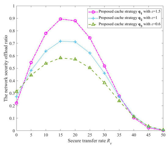Figure 3 corresponds to optimization problem , which illustrates the optimization of the secure transmission rate for a given caching strategy. The specific values of the caching strategy adopted in Figure 3 are given in Table 2. As can be seen from Figure 3, with the secure transmission rate increasing, the network security offloading ratio curve first increases to the extreme point and then drops rapidly. This phenomenon also verifies that our optimization scheme has an optimal solution. In addition, we can also observe that there is still the network security offloading ratio even when the secure transmission rate is zero, because the effect of self-caching is considered in our proposed caching strategy. We comprehensively take into account the factors of successful connection and security transmission of V2V communication in the proposed caching strategy. Therefore, under the condition of a very low secure transmission rate, the main way to obtain files by the proposed caching strategy may still be through self-caching. This may lead to the phenomenon that the curve starts. When the secure transmission rate is very low, the network security offloading ratio of the cache strategy is lower than that of .
