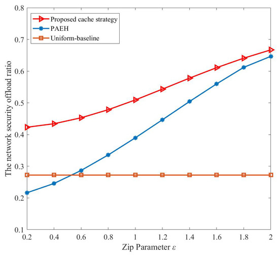 Figure 4 compares the proposed caching strategy, PAEH caching strategy and uniform-baseline caching strategy, with the increasing Zipf parameters. From Figure 4, we can easily see that the network security offloading ratio brought by the proposed caching strategy and PAEH caching strategy will increase rapidly with the increase of Zipf parameters. However, the network security offloading ratio of the uniform-baseline caching strategy is fixed on a horizontal line and does not change with the increase of the Zipf parameters. This result is the same as we expected, because the uniform-baseline caching strategy does not take into account the popularity of files, but caches all files with equal probability. Of course, the network security offloading ratio of the Uniform-baseline caching strategy is also the worst. Furthermore, we can also see that when the Zipf parameter is small, the proposed caching strategy is significantly better than the PAEH caching strategy, but the gap gradually decreases as the Zipf parameter increases. This is because the caching probability of our proposed scheme is strongly correlated with the probability of requesting files. The increase of popularity factor means that the probability of being requested for the most popular file increases. This will lead to the cache probability of the most popular file approaching 1, and the cache probability of other files approaching 0. When the popularity factor gradually increases, both the proposed caching strategy and the PAEH caching strategy cache the top files, so the network security offloading ratio is gradually approaching.