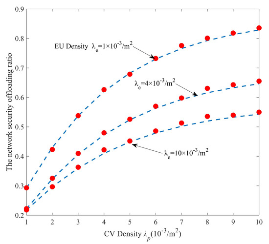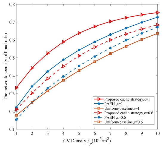 In Figure 5, we investigate the effect of different CV densities and EV densities (/m, /m, /m) on the security offloading ratio of the MEC-enabled air-to-ground integrated IoV. Monte Carlo method is used to obtain the simulation results. From Figure 5, we can see that the simulation results match well with the theoretical values. This indicates that the theoretical derivation of this paper is reasonable. By analyzing the abscissa in Figure 5, we can conclude that the network security offloading ratio increases with the increase of CV density. This is because the increase in CV density also increases the probability of the RVs finding the surrounding required files. In addition, with the increase of CV density, the network security offloading ratio increases slowly and gradually tends to balance. This indicates that when the CV density reaches a certain value, the CV’s cache capacity will become the main influencing factor of the network security offloading ratio. Furthermore, it can be seen from the three EV density curves that the network security offloading ratio decreases as the EV density increases. The reason for this phenomenon may be that the proposed caching strategy considers the factors of successful V2V communication connection and secure transmission. When the EV density increases, the risk of the file secure transmission also increases, which may lead to the decrease of the network security offloading ratio. In addition, with the increase in EV density, the network security offloading ratio will decrease slowly. The main reason is that the proposed caching strategy takes into account the impact of self-caching, which can ensure that the files can be obtained confidentially through self-caching even when the communication conditions are very risky.