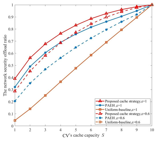 In Figure 7, we compare the network security offloading ratio of the proposed caching strategy, the PAEH strategy, and the uniform-baseline caching strategy under different CV cache capacities. It can be seen from Figure 7 that the proposed caching strategy, the PAEH strategy, and the uniform-baseline caching strategy all increase with the increase of CV cache capacity. Due to the consideration of self-caching by all caching strategies and our assumption of a limited file library , when the CV cache capacity is , the network security offloading ratio of all caching strategies can reach the maximum value. In addition, we can also observe that with the increase of CV capacity, all cache strategies gradually narrow the gap in network security offloading ratio. Because when the cache capacity of the CV is large enough (compared with the file library), the probability that the requester obtains the required file through the self-cache is increased. At this time, the proportion of caching strategy and file popularity distribution to network data offloading will decrease. Therefore, the network security offloading ratio curve is gradually approaching. Furthermore, the proposed caching strategy is better than the PAEH strategy and the uniform-baseline caching strategy due to the consideration of the successful transmission of V2V communication. Since the uniform-baseline caching strategy does not fully utilize the cache space (all files are cached with the same probability), its network offloading ratio is the worst.