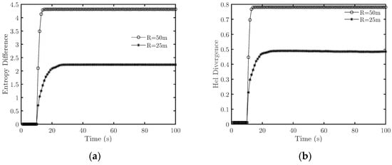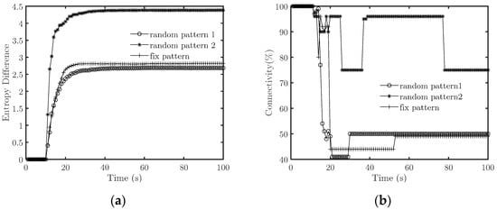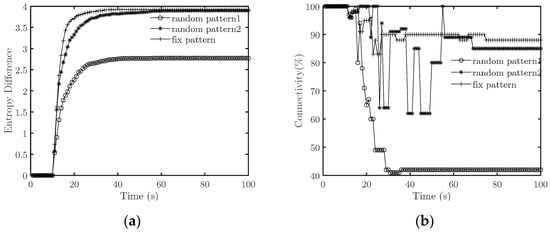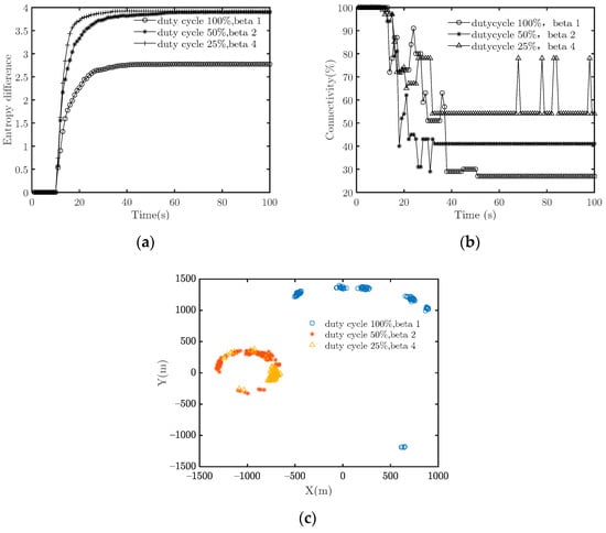 When there is no interference signal, the entropy difference becomes stable before t = 15 s, and the connectivity remains greater than 95%, so s. When emitting an interference signal, the entropy difference first increases with time and then tends to be a constant value. Combined with Figure 5, we find that the system does not achieve cooperative fly when the duty cycle is 100% and 50%, which means the countermeasures succeed. In comparison, the system achieves cooperative flight when the duty cycle is 25%, which means the countermeasures fail. Specifically, when the duty cycle is 50%, the system’s connectivity decreases to about 56%. When t = 29 s, it fluctuates violently and finally stabilizes at about 82%. When the duty cycle is 100%, the interference causes the connectivity to drop to about 75% when t = 17 s, which means the system splits earlier under an interference signal with a large duty cycle.