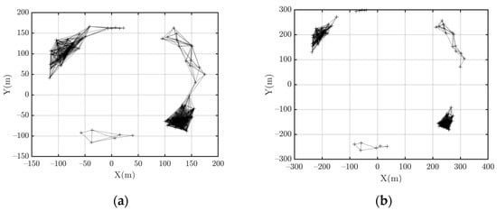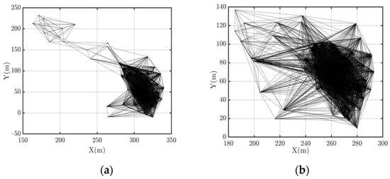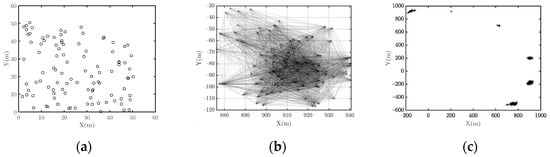 As presented in Figure 1a, the curves have a similar trend when R is set to 50 and 25 m, i.e., the entropy difference increases first and then stabilizes. The experiment on Hel diversity (as shown in Figure 1b) is similar to Figure 1a. However, if we inspect the network connectivity, we find the differences between the two cases. When the simulations start, the networks are connected, and the nodes are distributed in the 50 m × 50 m area. The topology is depicted in Figure 2a. When R = 50 m, at the end of the simulations, the network is still connected, and the nodes are distributed in a larger area (Figure 2b). When R = 25 m, the network splits into multiple disconnected sub-clusters (Figure 2c). This indicates that when R = 50 m, the system has achieved cooperative fly, but when R = 25 m, at the end of the simulation, the network splits into several disconnected parts. Thus, when R = 25 m, the UAV swarm fails to achieve cooperative flight.