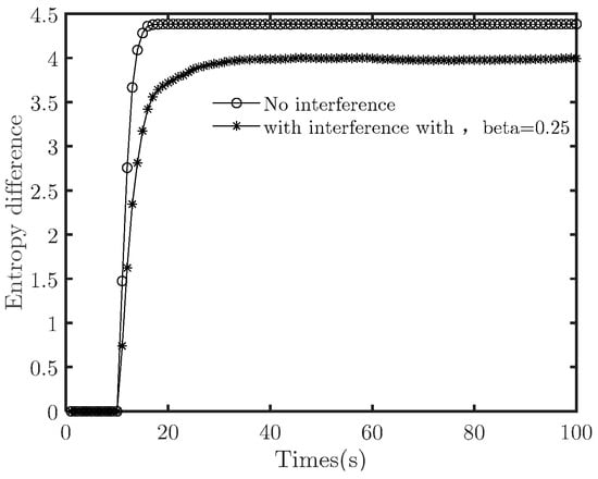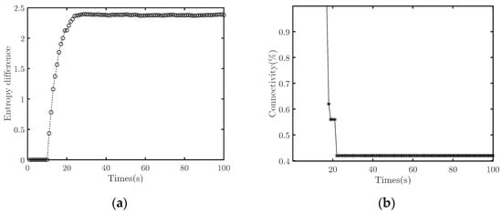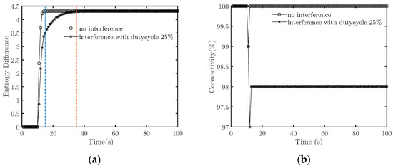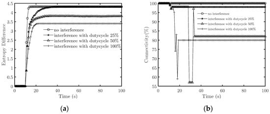 First, we set to 1 when the duty cycle is 100%. The interference signal reduces the signal-to-noise ratio to half the original. Figure 4 illustrates how the target system’s entropy differences and connectivity change with time when the duty cycle is 0 (i.e., no interference), 25%, 50%, and 100%.