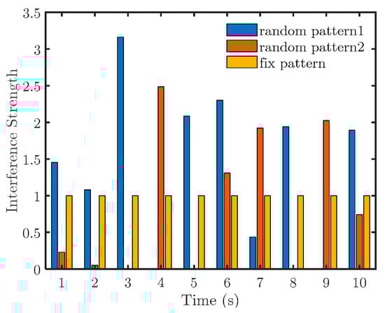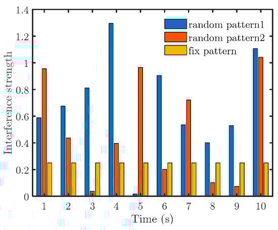 First, we set to simulate medium-strength interference. Figure 7 depicts the simulation results of two random and one fixed pattern. The specific interference intensities are presented in Figure 8.