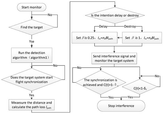 | ① Initialize connectivity threshold , and start monitoring. If the target system is detected, go to step ②. Otherwise, go to step ①. ② Use Algorithm 1 to determine whether the target system starts the cooperative fly. If it starts, go to step ③. Otherwise, go to step ②. ③ Measure the distance to the target cluster and calculate the path loss as [25]: and f is the operating frequency. The path loss is calculated as follows: ; ④ Generate interference pattern according to counter intention and and emit the interference signal. The interference pattern is as follows: 4a. To delay cooperative fly, a low-intensity continuous jamming signal (i.e., duty cycle 100%) is sent, and the equivalent noise figure is set to , 4b. To break the cooperative fly, the equivalent noise figure of medium intensity continuous jamming signal (i.e., 100% duty cycle) is sent, and the equivalent noise figure is set to ⑤ Measure . If , or and the target system achieves cooperative fly, immediately terminating the interference. |
