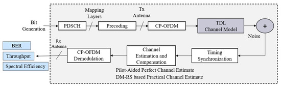 Figure 3. In this processing chain, we configure the PDSCH transmitter and receiver in which the basic communication steps are followed by generating the data, PDSCH encoding, MIMO precoding, modulation, propagation channels such as the TDL channel model and noise addition, demodulation, pilot-aided perfect and DM-RS-based practical channel estimation and compensation, and LDPC decoding to obtain the BER, maximum achievable throughput, and spectral efficiency. The modulation schemes, such as QPSK and different orders of QAM (e.g., 16, 64, and 256), are used in NR-PDSCH. For NR data channels, a low-density parity-check (LDPC) coding scheme is used. The TDL channel model is utilized for the link-level performance analysis of the simulation. The single-path (1P) Rayleigh and Rician fading components are analyzed from the TDL channel model, designed by 3GPP, where one tap is considered a single path [