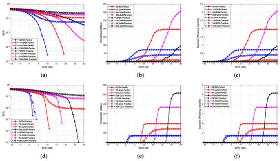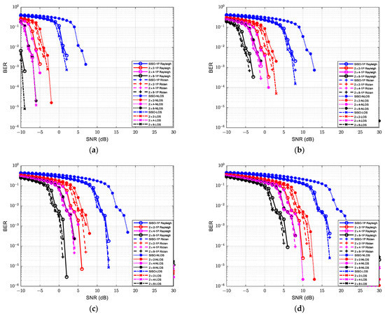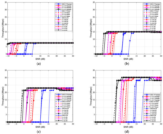 Figure 6d, to obtain a maximum throughput of 30 Mbps, the 256-QAM under NLOS (TDL-A) channel model requires a minimum SNR(dB) of 18, 9, 6, and 5 dB for SISO and MIMO (2 × 2, 2 × 4, and 2 × 8) cases, respectively, and with MCS of QPSK under a TDL-E channel model, whereas 13, 8, 5, and 2 dB are required. This analysis shows that when the MIMO and 3D beamforming schemes are utilized, the maximum achievable throughput increases even at low SNR values.