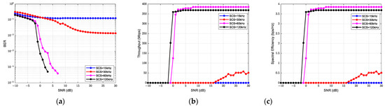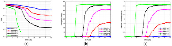Figure 9. A large number of transmit and receive antennae, such as (8 × 8) MIMO, have shown the highest link reliability. The maximum achievable throughput of 368.832 Mbps and spectral efficiency of 2.705 bps/Hz is achieved by the MIMO 8 × 8 scheme. The results in