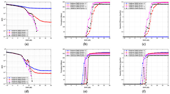 Figure 10. The simulation results show the improved link reliability with the three additional DM-RS symbols utilized in practical channel estimation, which is the denser symbol pattern of DM-RS symbols. High link reliability can be achieved despite sacrificing the throughput and spectral efficiency at UE mobility of 500 km/h. The front-loaded DM-RS enables fast decoding, which helps to improve link reliability. Therefore, this paper proposes 5G-NR physical layer elements, such as the SCS of 120 kHz, high MCS levels, such as 64-QAM or 256-QAM, and dense DM-RS symbol pattern-based channel estimation under MIMO schemes to support high mobility up to 500 km/h in NTN.