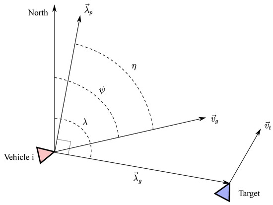 Consider the horizontal projection of the UxV and target-relative kinematics in the inertial frame illustrated in Figure 2. Let and be the UxV’s velocity vector and heading angle, respectively. Let be the magnitude of . Let be the speed of the target and be its heading angle. Let be the horizontal distance between the UxV and the target. Let be the LOS phase angle, let denote the LOS vector, and let be the vector perpendicular to . Finally, let denote the angle between and , which can be written as