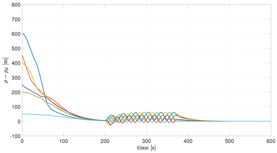 Consider now a set of n UxVs and let , , and be the speed, the heading angle, and the LOS angle of the i-th vehicle (), respectively. Furthermore, let and be its VBT errors with the dynamics described in Equation (3). The objective of coordination is to drive the difference between the UxVs LOS phase angles to a desired value, in order to maintain a desired phase separation. Thus, we consider the i-th and j-th vehicles to be coordinating at time t if their LOS angles satisfy the condition