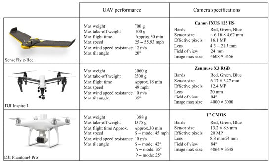 UAV performances and camera specifications of platforms used for data acquisitions.