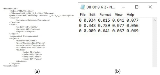 Annotations generated by LabelImg tool. (a) Annotation in Pascal VOC format. (b) Annotation in YOLO format.