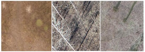 For the positive samples, the fixed amount was determined by the size of the labeled dataset. The positive samples dataset contained 120 tiles (Figure 5), that is, there were 120 images in the first case. In the second case, there were 120 images for positive samples and 120 random negative samples (Figure 6), chosen in such a way that the number of positive and negative sample tiles from each image was the same. The number of negative samples in the third case was substantially larger, with 2220 tiles containing no animals, summing up to 2340 images in total. The annotation file in the case of the negative samples was an empty txt or xml file.
