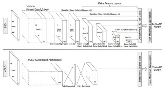 A comparison between the SSD and YOLO network architectures [21]. The architecture of YOLO uses an intermediate fully connected layer instead of the convolutional filter used in SSD for the final predictions.