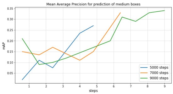 However, when we set the threshold of IOU to 0.75, that is, when we chose a more restrictive IOU, the mAP value significantly improved with a higher number of steps. This is shown in Figure 9, which shows that adding more steps for the training increased the mAP by up to 10% from 5000 to 9000 steps for the detection of medium-sized boxes. Since the main goal of this work was the counting of deer, and not strictly localizing them, we decided that IOU = 0.50 was sufficient for this specific problem.