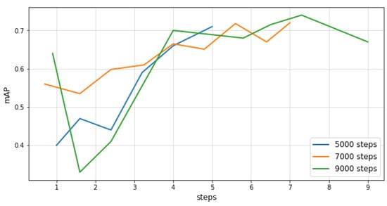 Next, we observed how the SSD network performed with more steps, as we noticed that the mAP value was very unstable in the early steps and became more stable after the 3000th step. For this reason, we trained using three cases, starting from 5000 steps and increasing by 2000 for each subsequent training process. There was a steady increase in the mAP value from approximately the 2000th step until the 5000th, after which the curve started to converge, i.e., more training was unlikely to lead to model improvement, so we deduced that 5000 steps was an optimal value and used it for further training. These values are shown in Figure 8. For this evaluation, mean average precision was used with an IOU of 50%.