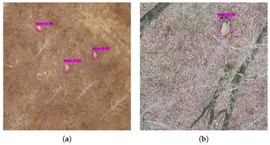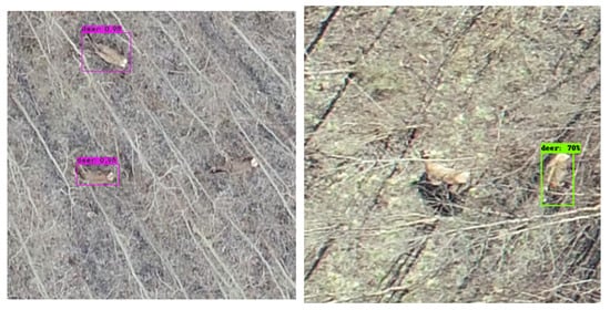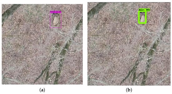 Based on research using the VOC2017 test set, the authors of [21] deduced that SSD performed much worse on smaller objects than on larger ones and was very sensitive to the bounding box size. Our mAP and recall results for the detection of small and medium objects confirmed this statement. Several comparisons of the detection results between different models are visualized in Figure 10 and Figure 11. As shown in Figure 10, the confidence scores of the predictions from both YOLOv4 and SSD were very high. However, in Figure 11, we can see that YOLOv4-tiny predicted the same deer with a much lower confidence score than YOLOv4 and SSD; however, on the contrary, it provided a very high confidence score for small target objects. When it came to real-time performance, YOLOv4-tiny was significantly faster than all the other trained models—up to four times faster than YOLOv4 and v3 and two times faster than SSD.