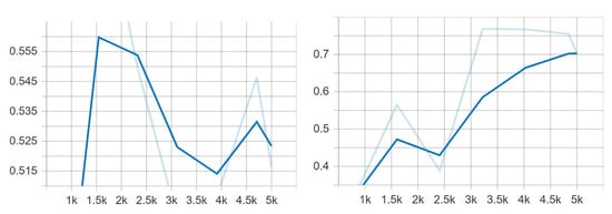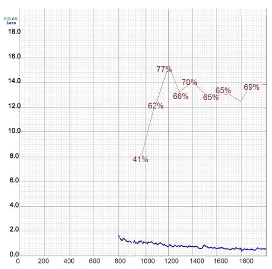 In the case of YOLOv4, the best results were achieved in the second case, as suggested by the authors of that model, who inspired the idea for the three evaluation cases by stating that the optimal situation was for the model to have as many negative samples as positive. YOLOv4 performed slightly better in the second case, with a 1.24% higher mAP and a 3% better precision. Although the difference was not significantly large, our model was trained on only 2000 steps. We suspect that the difference would be higher for a higher number of classes and, therefore, more training steps. The changes in the other measures were proportional to the changes in the mAP value and precision. The loss and mAP values during the training of YOLOv4 in the first case are shown in Figure 17.