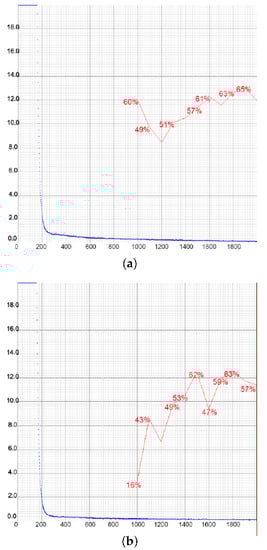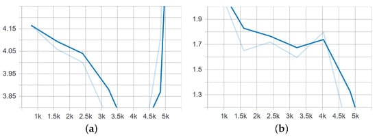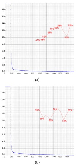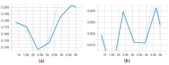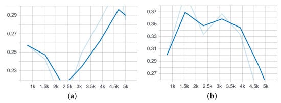 We noticed that the highest mAP was achieved around the 1200th step, after which it fluctuated. However, the model saved the weight periodically at each 1000th step, so for the testing we chose the weight file with the highest mean average precision. The first calculation of the mAP was carried out around the 1000th step. Figure 18 shows the training results for the third version of YOLO in the first (a) and second (b) cases.