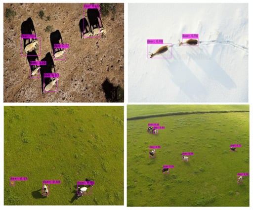 Dealing with the detection of small target objects was a challenging task, in which we faced many issues. One of the main problems was the diversity of the input images, as shown in Figure 23. For instance, images could have different resolutions and different sizes, and small objects could be overlapped by other objects. When this happened, the model usually produced a false negative prediction, i.e., not detecting a deer when there was in fact one present.