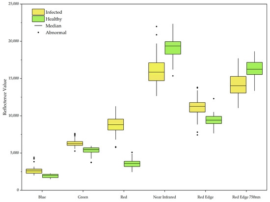 - We compared the characteristic differences in multispectral bands between healthy and PWD-infected trees by conducting experiments with data collected in the field.