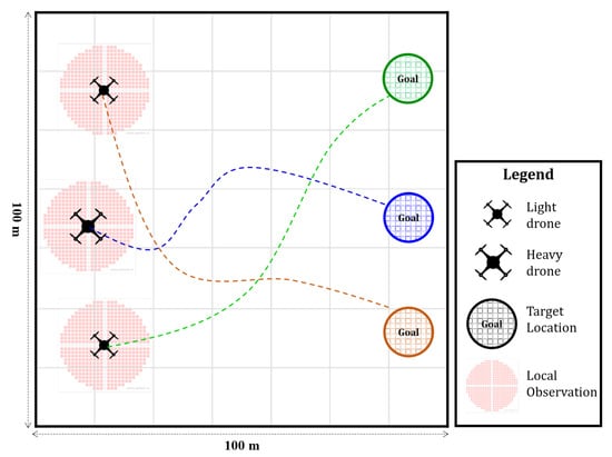 where is the position of the UAV controlled by the agent, and is the 2D target location set for this agent in the environment. It is assumed that UAVs fly at a fixed altitude.