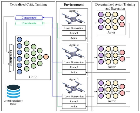 Centralized training and decentralized execution (CTDE) [14] is an approach to MARL where the computational complexity is offloaded onto the training process rather than execution. A popular implementation of this approach is the centralized critic training and decentralized actor execution (as illustrated in Figure 2), which is an extension of the policy–gradient actor–critic model. Particularly, the critic network is trained offline, without constraints on real-time performance. The main purpose is to facilitate obtaining decentralized policies that could accomplish the cooperative multi-agent task through access to global information obtained by multiple agents during training, but not execution. In such a setting, every agent partially observes the environment and hence the problem could be modeled using an extension of Markov decision processes for multiple agents. This extension is referred to as a decentralized partially observable Markov decision process (Dec-POMDP) and is formulated as a five-tuple encapsulating: