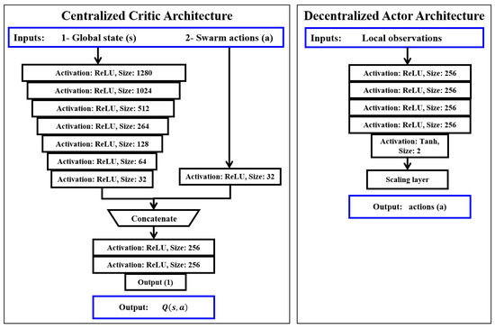 An actor–critic agent is adopted to perform the cooperative navigation task. The critic is centralized and hence receives global input from the swarm, while the actor is decentralized where it processes local observations. Figure 3 shows a detailed description of the architecture of both the critic and actor. The critic consists of two input paths, one for the global state and the other for the swarm actions. The states are passed through seven hidden dense layers, activated using the rectified linear unit (ReLU), while the actions are passed through a single ReLU activated dense layer.